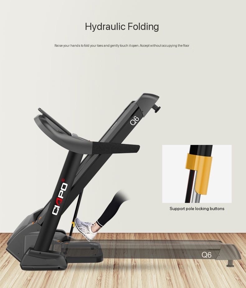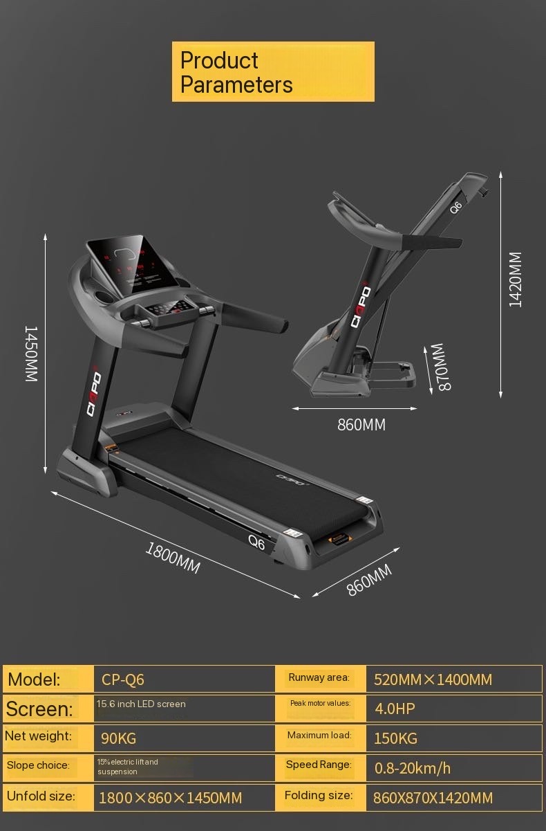 The CP-Q6 Home Treadmill is a high-performance fitness machine designed for home workouts, offering advanced features to enhance your training experience. Built with durability, convenience, and comfort in mind, this treadmill is perfect for users of all fitness levels looking to achieve their fitness goals from the comfort of their home.